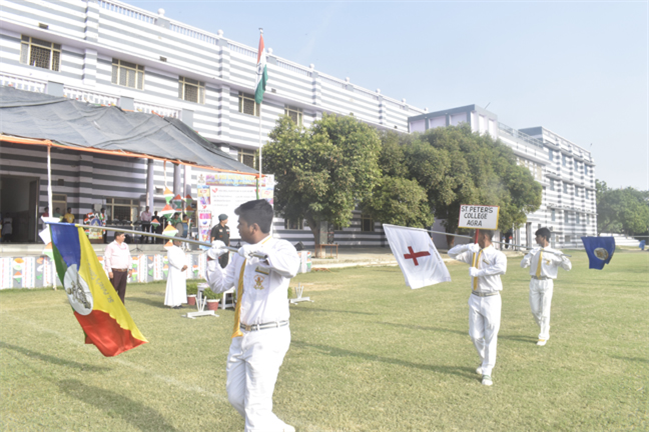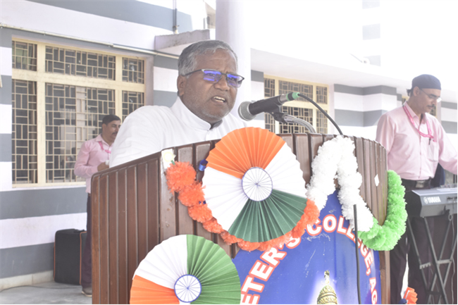 77th Independence Day was celebrated in St. Peter's College with great enthusiasm. The programme started with prayer for the Nation.... The college students presented March Past. Rev. Fr. Bhaskar Jesuraj and Chief Guest Lt. Col. Shanshak Kushwaha (Ex-Peterian) unfurled the National Flag. Group songs and dances of different houses were put up on the stage. The programme was ended with the speech of Chief Guest and Fr. Principal.